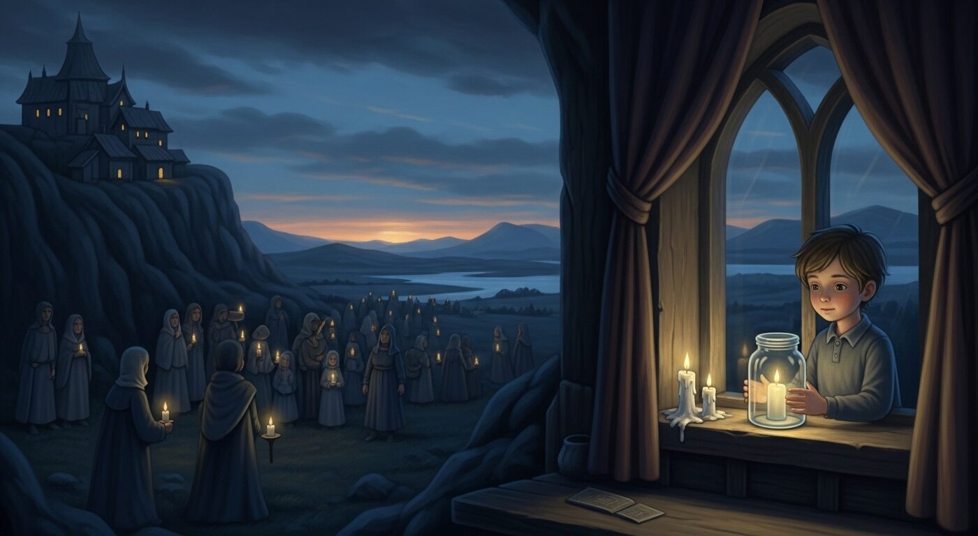 Foreground composition centers on a young boy named Eli (approximately 10–12 years old) standing near a tall arched window inside a modest stone house. He is holding a small glass jar containing a softly pulsating warm golden light, as if alive. The jar emits subtle particulate glow, illuminating his hands, face, and the surrounding wooden sill with realistic subsurface scattering. His expression is calm, hopeful, and introspective, with soft facial lighting that emphasizes skin texture, faint freckles, and natural imperfections.